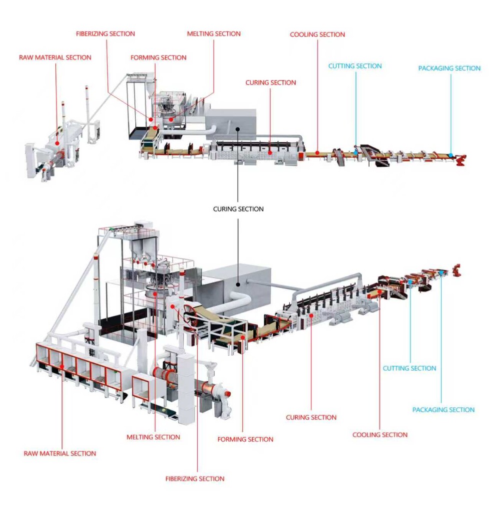 Typical process flow of a high-capacity rock wool production line, from melting and fiberization to curing and cutting.